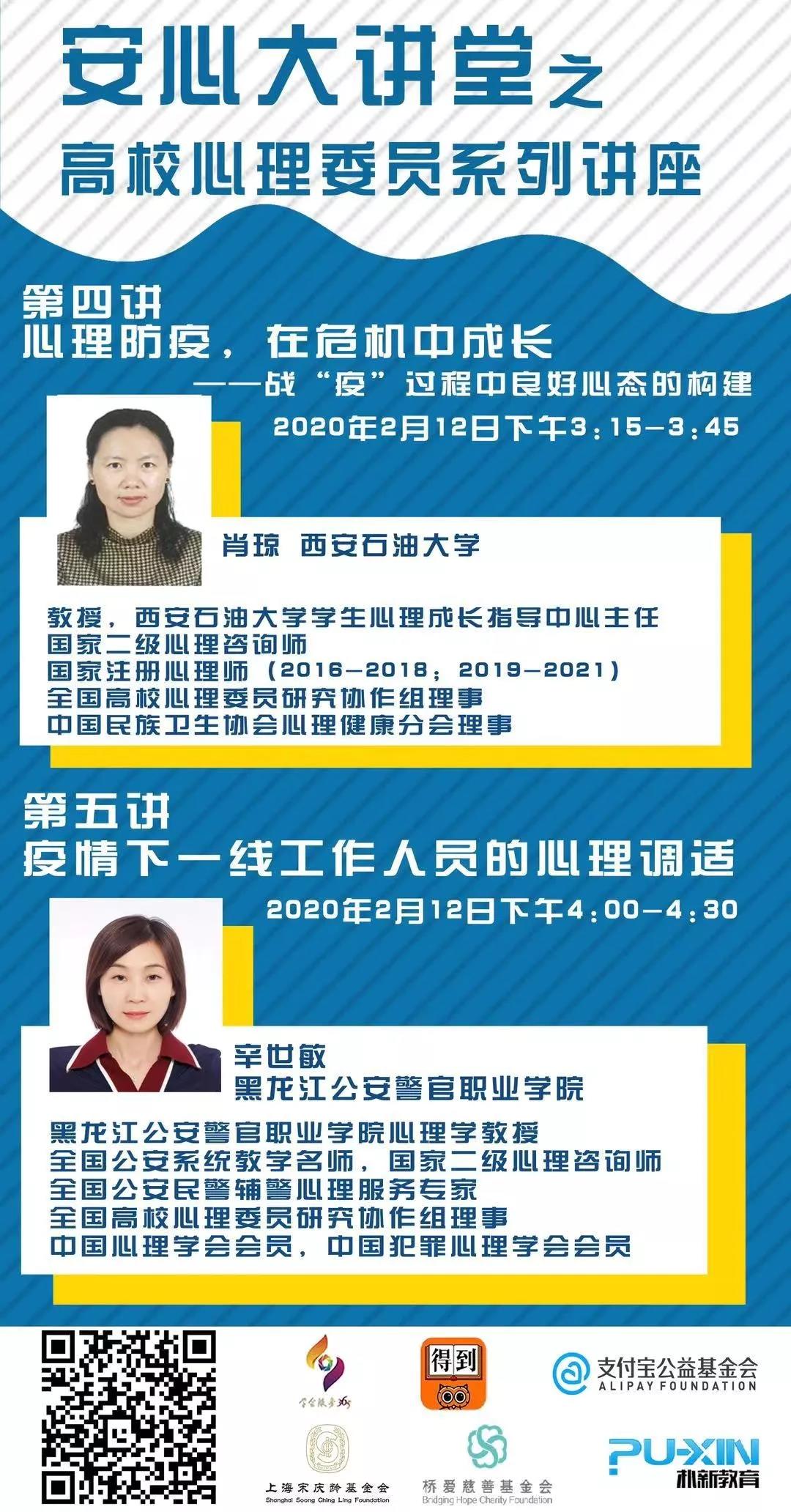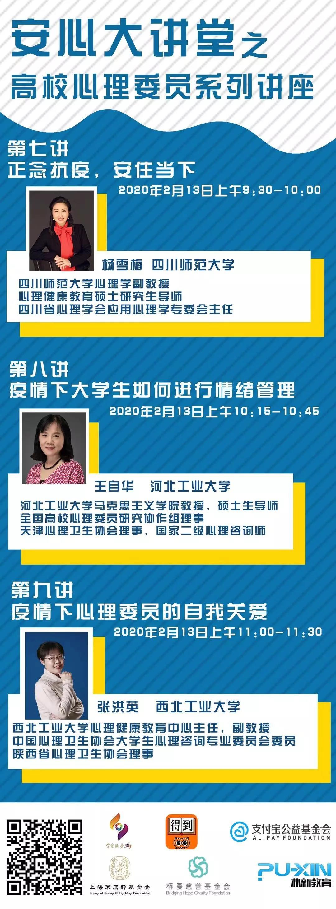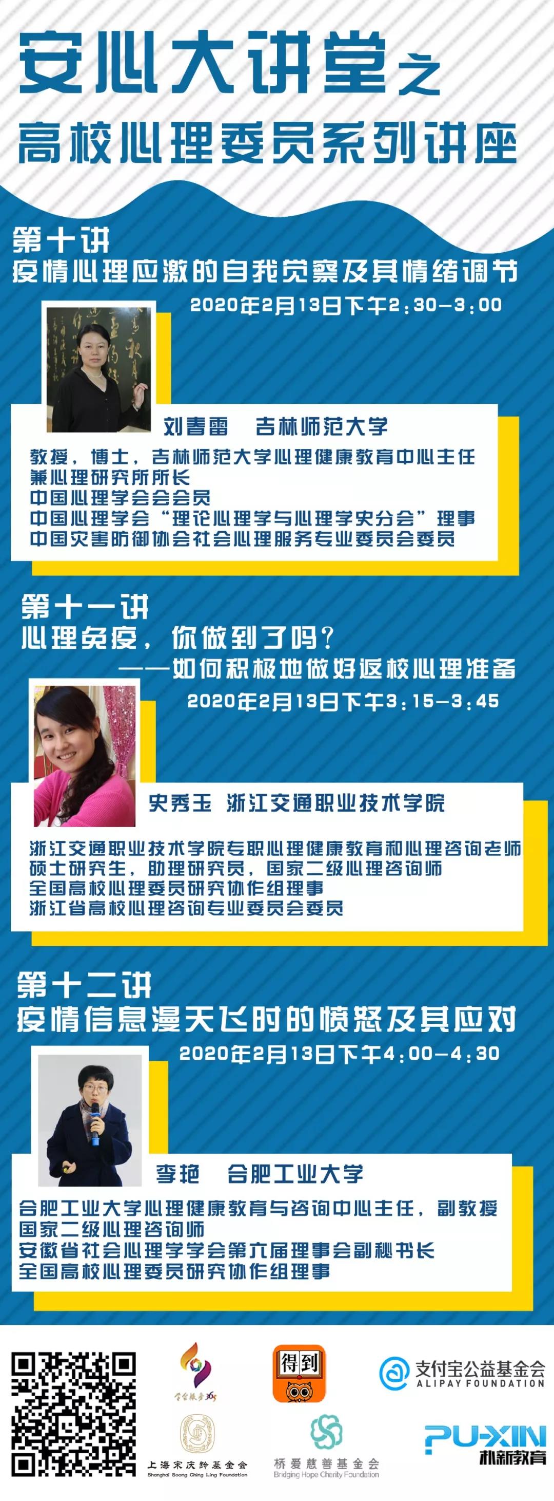 中国心理学会与中科院心理所联合开展的“抗击疫情安心行动”已于2020年1月30日晚正式启动,“抗击疫情安心行动”的高校组专家成员经过前期准备,决定在2月12-14日面向全国高校心理委员及其班级同学开展系列公益讲座,共18位专家组成员将开展20个专题讲座。