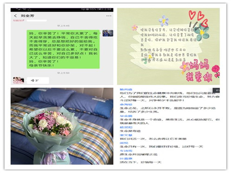 为拉近师生间距离,加强学生情感交流,促进亲子沟通,引导学生学会感恩,珍惜当下,乐享生活。土木学院举办了“云端的温暖—晚安计划”和“为妈妈做顿饭”母亲节活动,材化学院开展了第一届“云”电子竞技大赛、第一届“云上相约,共展魅力”快乐无敌云聚会活动和第一届“宅家乐”线上歌手比赛,数理学院开展了“浓情五月天,感恩行动时”劳动节感恩活动,外国语学院组织“学会感恩,珍惜当下”生命故事分享会等,通过开展内容丰富的各项活动,营造了积极健康温暖的交流氛围,促进了学生之间的交流与合作,让学生感受“云返校”的温暖,表达了对战役者们、最美劳动者和母亲最深切的祝福和感恩之情,传递了温暖和力量。