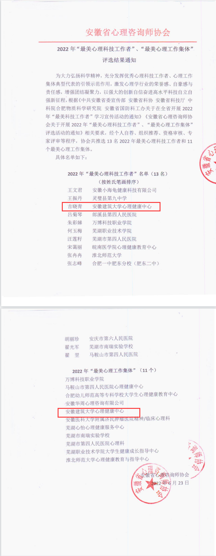 为大力弘扬科学精神,充分发挥优秀心理科技工作者、心理工作集体典型代表的引领示范作用,大会对2022年优秀心理科技工作者、心理工作集体代表进行颁奖,学校心理健康中心获得“最美心理工作集体”称号,中心吉晓青老师被评为“最美心理科技工作者”。