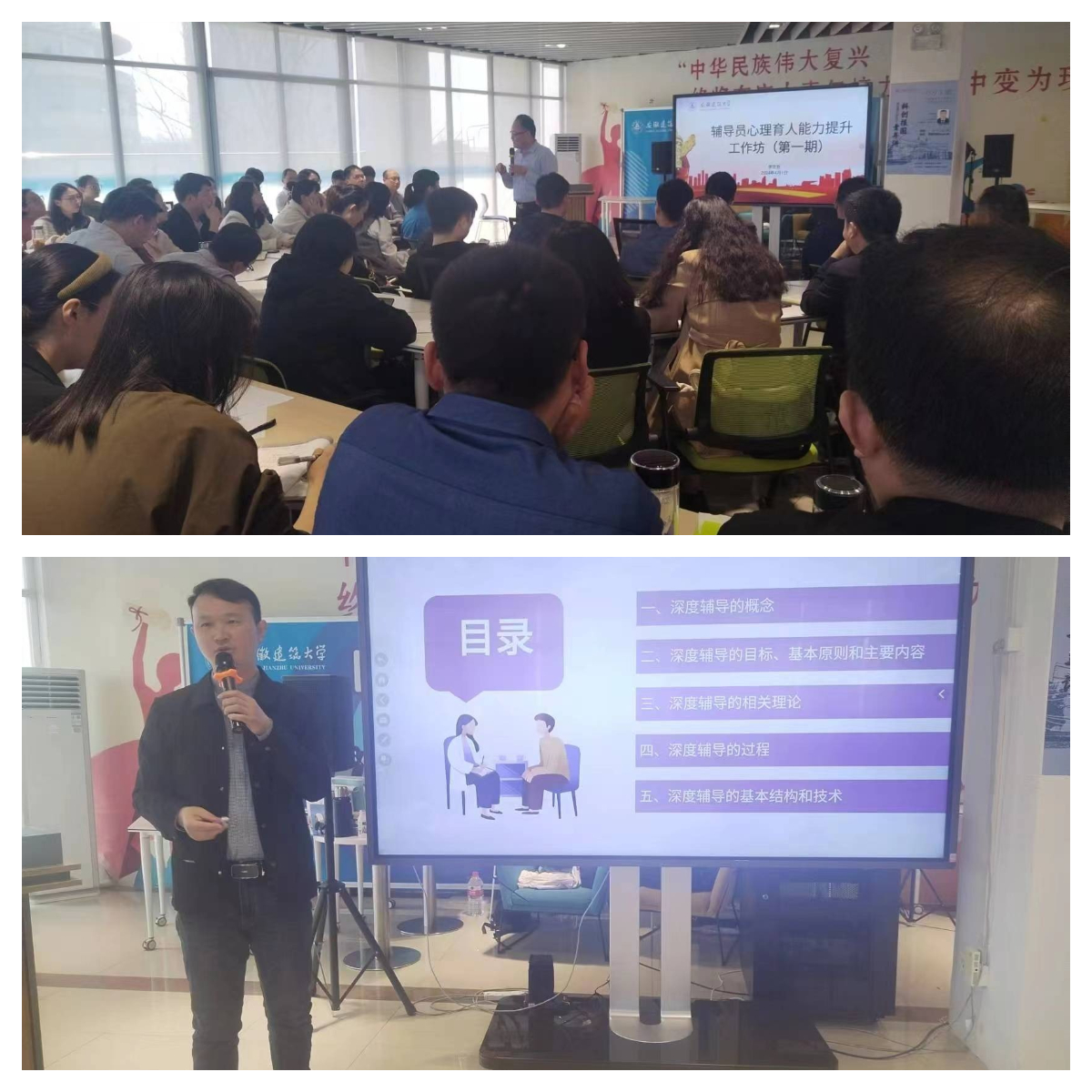 本网讯 为贯彻落实教育部等十七部门印发的《全面加强和改进新时代学生心理健康工作专项行动计划(2023-2025)》和中共安徽省委教育工委、安徽省教育厅等十七部门印发的《全面加强和改进新时代学生心理健康工作的若干举措》等文件精神,全面加强和改进学校心理健康教育工作,助力辅导员进一步提升在谈心谈话技能、心理危机识别、预防和疏导干预等方面的专业水平,4月1日上午,学校举办第一期辅导员心理育人能力提升工作坊。各学院分管学生工作副书记、全体专兼职辅导员参加了此次工作坊。工作坊由学工部负责人主持。