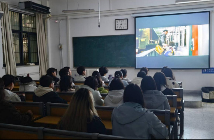 观影过程中,各教室内秩序井然,同学们全神贯注沉浸于剧情之中。当看到克里斯因事业失败陷入贫困,带着儿子睡在地铁卫生间、排队争抢收容所床位,却始终没有放弃对工作的执着和对生活的希望时,不少同学被这深沉的父爱与顽强的毅力深深打动,眼角泛起泪光;而当克里斯最终凭借不懈努力获得理想工作,与儿子相拥在夕阳下的场景出现时,现场响起了热烈的掌声。光影流转间,同学们跟随主角的人生轨迹,体会着挫折与坚守、迷茫与希望交织的人生历程,更对“幸福”的真谛有了深刻思考。
