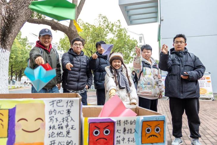 在这个环节中,同学们领取了不同颜色的色纸,将心事书写在上面同学们或低头沉思,或奋笔疾书,将这段时间积压在心底的心事、烦恼、对未来的期许亦或是生活上学习上的喜悦,一笔一划地写在纸上。随后,大家郑重地将这些承载着情绪的纸张折成形态各异的纸飞机,用力投掷进对应情绪的纸箱中。