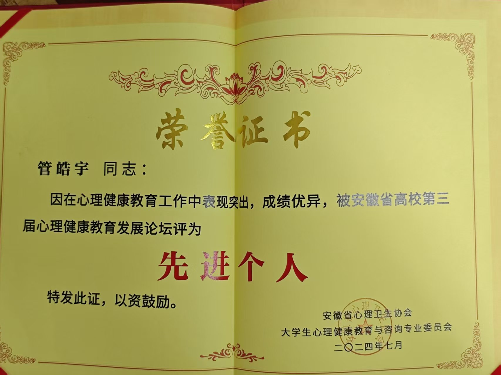 管皓宇老师荣获先进个人