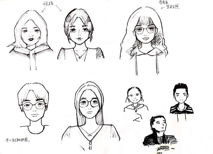 相对内向的我转了专业,不熟悉的班级和不熟悉的同学,我第一个便画了我自己。慢慢地,我又认识了班长、学习委员等人,我画他们,似乎只因他们对我来说比较熟悉,并没有什么其他原因。但其实我错了,我画他们是因为他们成为了不可或缺的同学和朋友,所以我想尽量把他们画的好看一些。(via.葛运祎)