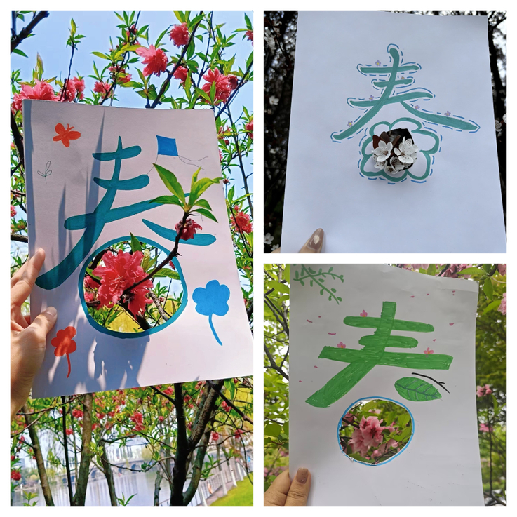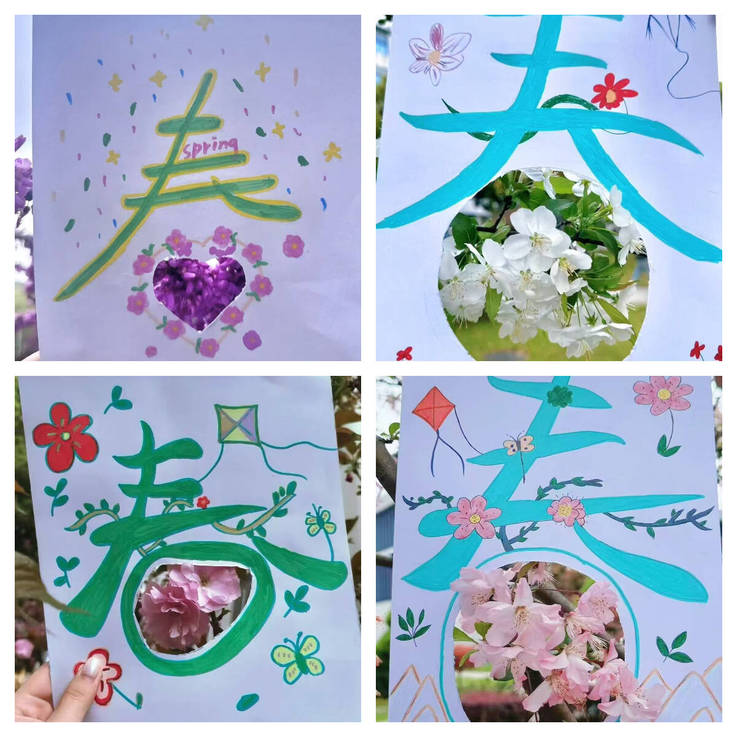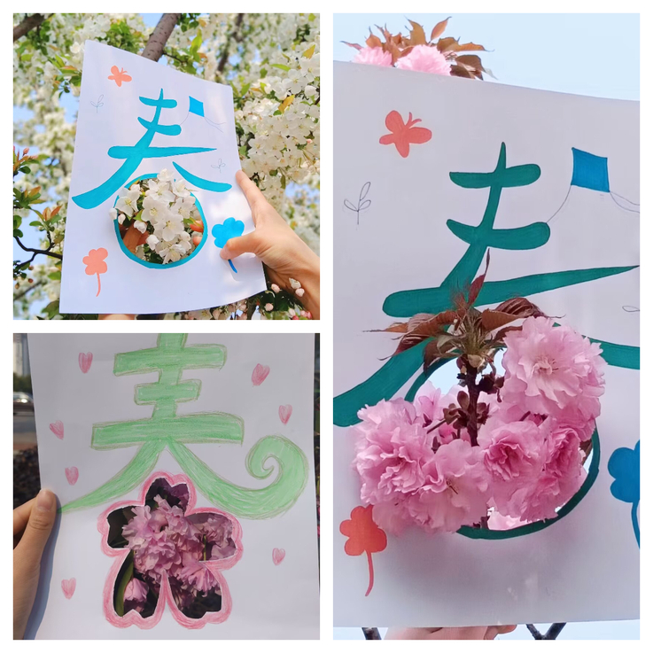 活动以汉字“春”为创意核心,鼓励同学们亲手制作镂空“春”字卡片,将校园春日盛景嵌入字间,以“字为框、景为画”的独特形式,定格春日美好。同学们走出宿舍、走进自然,在樱花、海棠、玉兰、杜鹃等春日繁花间取景创作,用画笔、手工与镜头,将汉字之美与自然之韵融为一体。一张张创意作品既展现了外院学子的审美创造力,也让同学们在亲近自然、动手创作的过程中舒缓了学业压力,放松了身心,实现了美育浸润与心理疏导的双向赋能。
