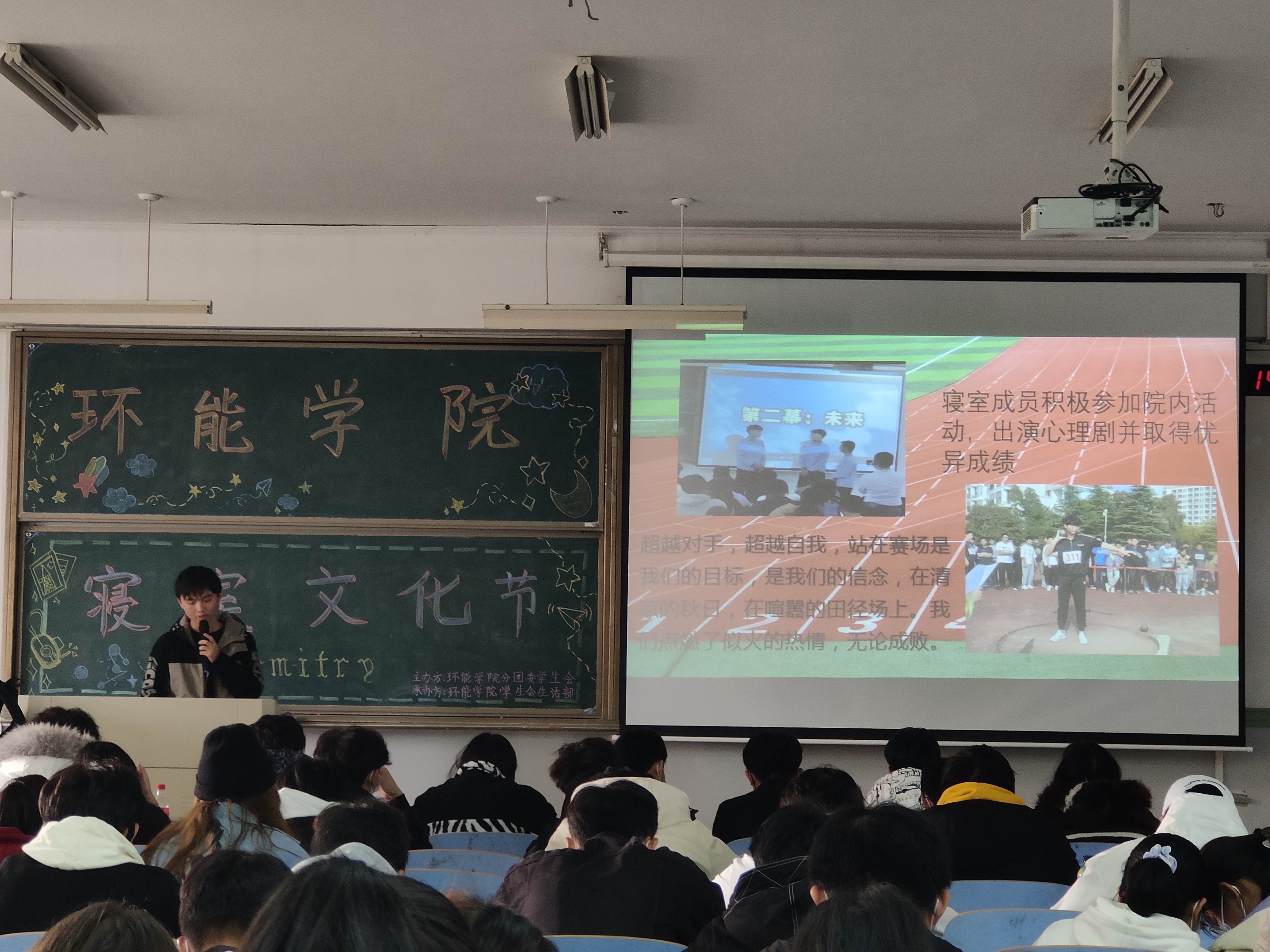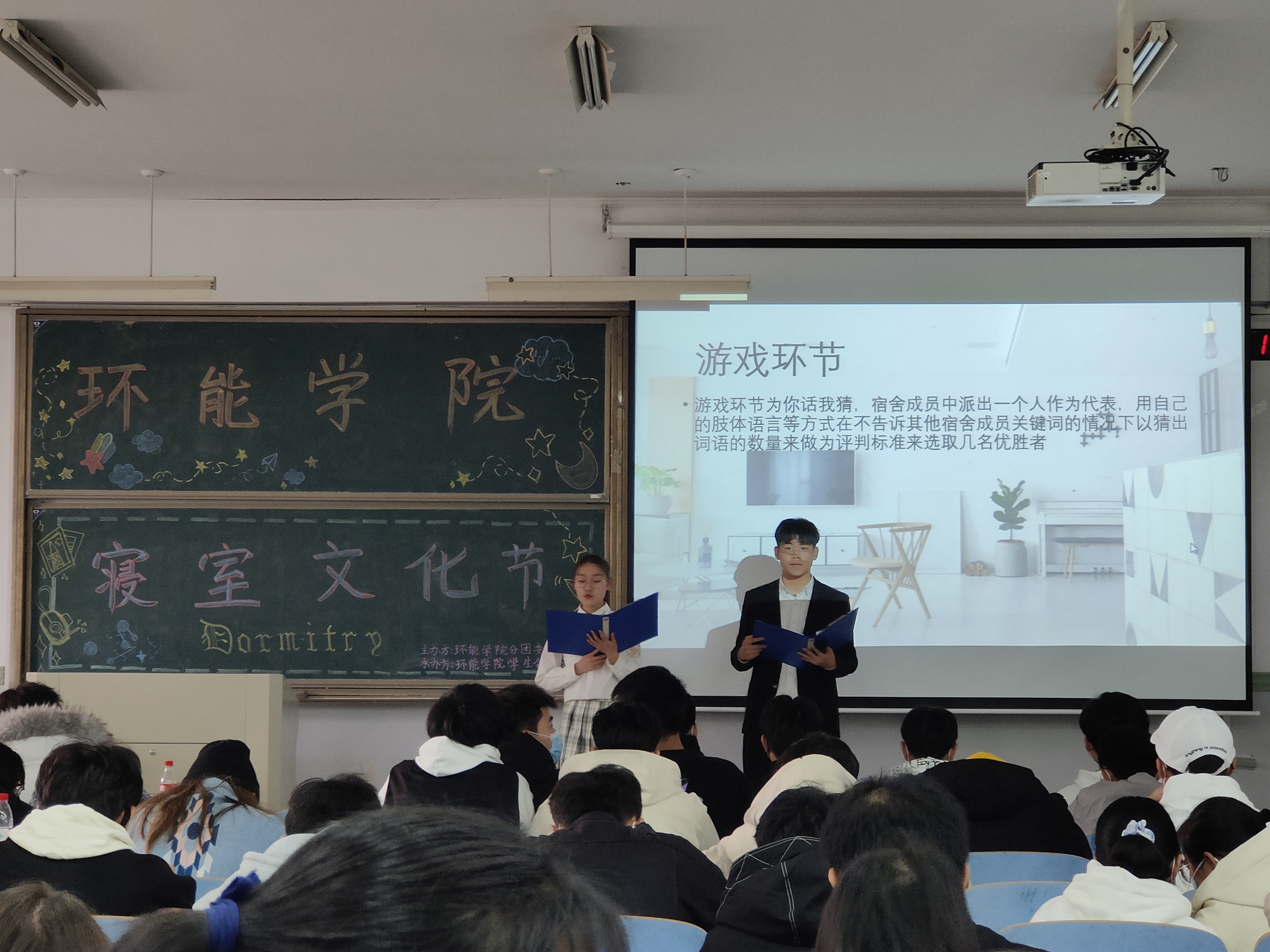 本次活动以寝室为单位,分线上初赛和线下决赛两个环节。初赛阶段,参赛寝室提交自己展示寝室文化和环境代表照片,并通过学院公众号“环能online”进行线上投票。在初赛阶段投票前15名进入决赛,决赛阶段要求环节中,各宿舍通过图片、视频等展示了特色鲜明、氛围良好的宿舍环境、宿舍文化以及宿舍成员,活动过程中还穿插了趣味游戏,现场的气氛一次次被推向高潮。经过激烈的角逐,12栋427室获得第一名,荣获“最佳寝室”称号。