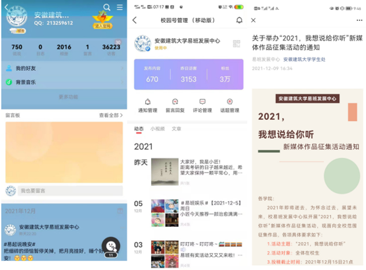 2021年,学生处秉持“搭建有情怀的平台 服务学生成长成才”的理念,将传播优质内容作为网络育人的重心,努力提升传播效果。本着坚持原创、服务学生的理念,紧密结合时事热点和校园热点,通过各类易班新媒体平台持续推进优质网络内容供给,为广大师生提供贴近校园生活的建大人、建大事,打造“易海‘易’家人”校园文化品牌。在微信公众号号开设“易起学党史”“易建拾光”“小憩易刻”“疑问易答”“易起吃叭”“易师心语”等专题14个,推进易班校本化深度融合;推送“逐梦新时代 奋进建大人四史宣讲”“青春告白祖国”“最美搬迁季”“萌新早知道”“榜样力量”优秀毕业生专访等内容,开展爱国爱校教育,加强榜样示范引领。多篇优质网络推文如“我在安建大,表白祖国”“注意啦!新生军训成果展示暨开学典礼看这里!”“萌新早知道│开学安全小贴士”“建大拼图│你真的够‘拼’吗?快过来挑战一下吧!”等被安徽省教育厅、安徽建筑大学官微转载宣传。聚焦建党百年、奥运精神、开学指南、考研等内容,在“易班·今日校园”主页制作易班轻应用广告18期,和学生关切紧密结合。通过易班校园号平台开通“你在读什么书”“我在易班上自习”“春分摄影比赛,捕捉校园春景”“晒一晒我的暑假生活”“运动风采易起拍”等话题10个,平均每个话题参与讨论近200人次,进一步提升学生网络素养,繁荣校园网络文化。2021年,学生处微信公众号发布推文298篇、“安徽建筑大学易班发展中心”官方QQ发布动态679篇、易班校园号发布动态和文章552篇。同时,以“校园百事通(易小班)”为抓手加强校园互动,提供校内优质问答,更新开学报到注意事项、评奖评优、考研等专题,累计解答师生提问57065人次。