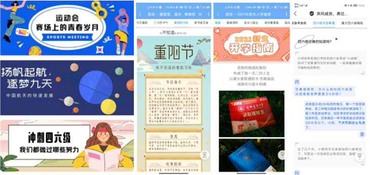 校易班发展中心秉持“搭建有情怀的平台 服务学生成长成才”的理念,将传播优质内容作为网络育人的重心,努力提升传播效果。本着坚持原创、服务学生的理念,紧密结合时事热点和校园热点,通过各类易班新媒体平台持续推进优质网络内容供给,为广大师生提供贴近校园生活的建大人、建大事,打造“易海‘易’家人”校园文化品牌。在微信公众号号开设“易起学党史”“易建拾光”“小憩易刻”“疑问易答”“易起吃叭”“易师心语”等专题14个,推进易班校本化深度融合;推送“逐梦新时代 奋进建大人四史宣讲”“青春告白祖国”“最美搬迁季”“萌新早知道”“榜样力量”优秀毕业生专访等内容,开展爱国爱校教育,加强榜样示范引领。多篇优质网络推文如“我在安建大,表白祖国”“注意啦!新生军训成果展示暨开学典礼看这里!”“萌新早知道│开学安全小贴士”“建大拼图│你真的够‘拼’吗?快过来挑战一下吧!”等被安徽省教育厅、安徽建筑大学官微转载宣传。聚焦建党百年、奥运精神、开学指南、考研等内容,在“易班·今日校园”主页制作易班轻应用广告18期,和学生关切紧密结合。通过易班校园号平台开通“你在读什么书”“我在易班上自习”“春分摄影比赛,捕捉校园春景”“晒一晒我的暑假生活”“运动风采易起拍”等话题10个,平均每个话题参与讨论近200人次,进一步提升学生网络素养,繁荣校园网络文化。全年微信公众号发布推文298篇、“安徽建筑大学易班发展中心”官方QQ发布动态679篇、易班校园号发布动态和文章552篇。同时,以“校园百事通(易小班)”为抓手加强校园互动,提供校内优质问答,更新开学报到注意事项、评奖评优、考研等专题,累计解答师生提问57065人次。