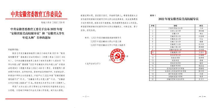 本网讯 近日,安徽省委教育工委公布了2022年“最美高校辅导员”推选结果,我校建筑与规划学院专职辅导员王昊禾获2022年“安徽省最美高校辅导员”,并被推选参加2022年全国“最美高校辅导员”评选,这也是学校目前唯一一位获得此项荣誉的辅导员。