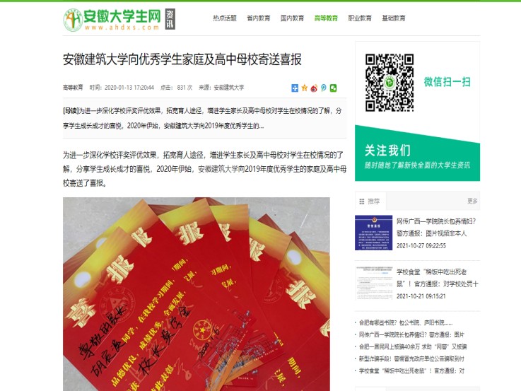 聚焦感恩励志,下好助人自助“一盘棋”。积极开展资助育人活动,以受奖助学生为主体,以感恩励志教育为内容,开展以“寄一封家书,看一本励志读物,听一场讲座,做一次志愿服务,写一篇成长报告”为主要内容的“五个一”励志成才教育活动,累计4万余名学生参与该项活动,取得了良好的育人成效,2017年3月24日,安徽青年报以《“五个一”工程“筑”起大学生精神新高地》为题对我校“五个一”主题教育活动进行了整版宣传报道。重视家校联系,延伸资助育人的范围,每年通过寄送喜报、贫困生家庭走访等活动,将学生在校期间表现情况反馈到学生家庭,建立良好的家校联络反馈渠道,累计寄送喜报1.4万余份。相关活动曾被《中国青年报》、中新网、安徽教育网等媒体宣传报道。遴选“学生资助宣传大使”开展学生资助宣传活动,结合招生宣传、百千万走访、暑期社会实践活动、送政策下乡、送政策回母校等宣传形式进行资助政策宣传。2018年3月15日,安徽广播电台全省新闻联播以《“学生资助之声”第八期——我省各高校组织学生担任“学生资助宣传大使”开展资助宣传活动》为题,报道学校学生资助政策宣传工作,并采访了我校国家奖学金获得者和学生资助工作人员等师生,安徽教育网同步予以报道。
