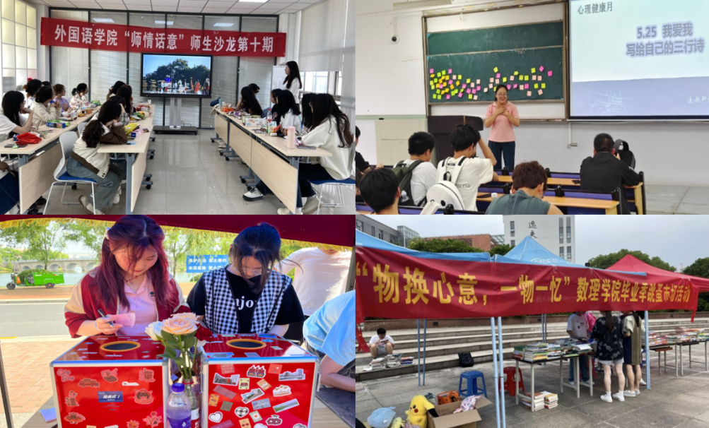 (图为外国语学院举办的“师情话意”师生沙龙、机电学院“5.25我爱我——三行情诗”活动、环能学院“心”箱解忧活动、数理学院“物换心意,一物一忆”毕业季跳蚤市场)