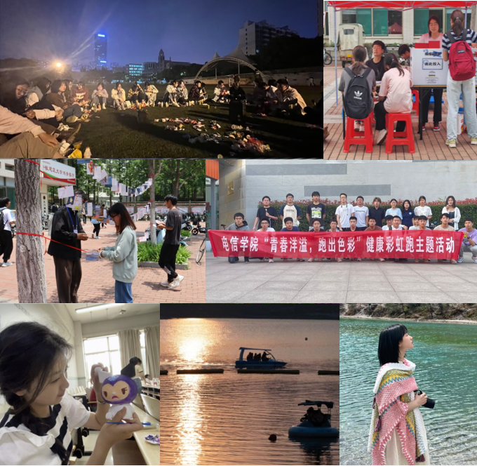 (图为经管学院团辅活动、土木学院“快乐分享桶”活动、建规学院“心语心愿枝头挂,玉兰树下寄祝福”活动、电信学院健康彩虹跑活动、外语学院手绘石英石活动和机电、环能学院摄影活动)