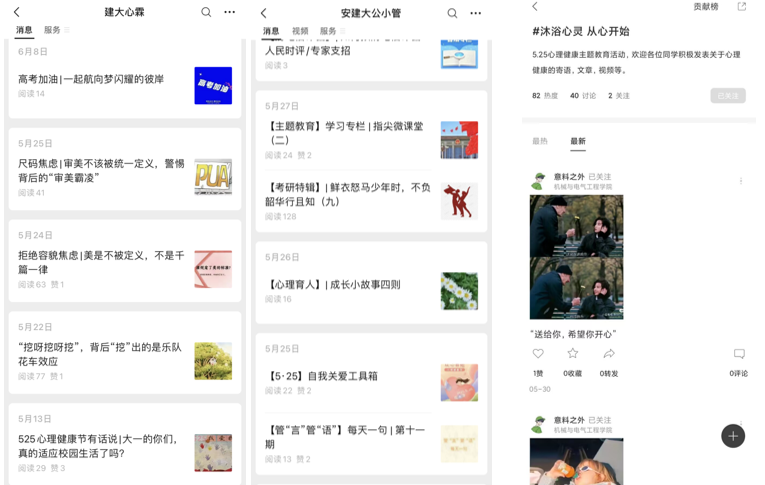 (图为“建大心霖”“安建大公小管”微信公众号和今日校园话题区分享心理健康知识、营造心理健康氛围)