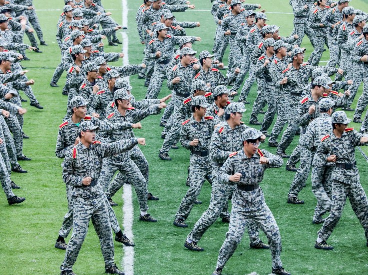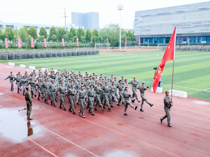 伴随着雄壮的国歌声,五星红旗冉冉升起,军事训练成果展示拉开序幕。全体新生身着迷彩服,迈着整齐矫健的步伐,以崭新的面貌、奋斗的姿态和昂扬的斗志,展现新时代青年意气风发、英姿飒爽的精神风貌。他们依次完成拼字方阵、行进间队列方阵、格斗术方阵、韵律操方阵、拉歌方阵、大合唱方阵等表演。
