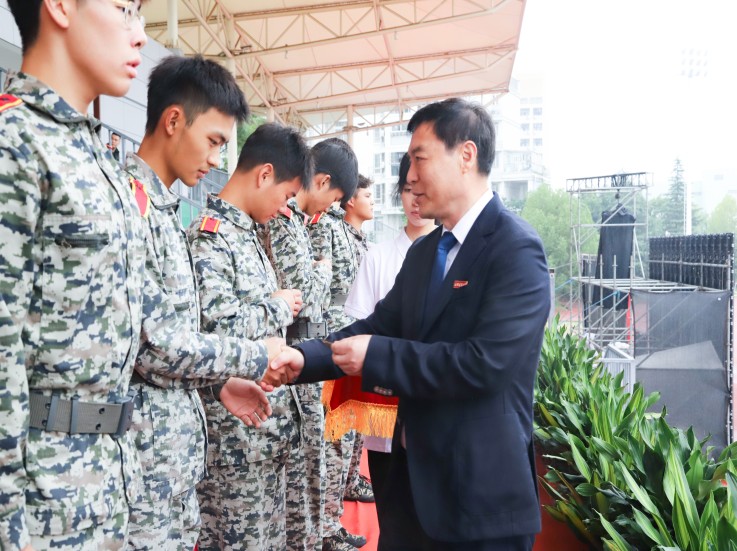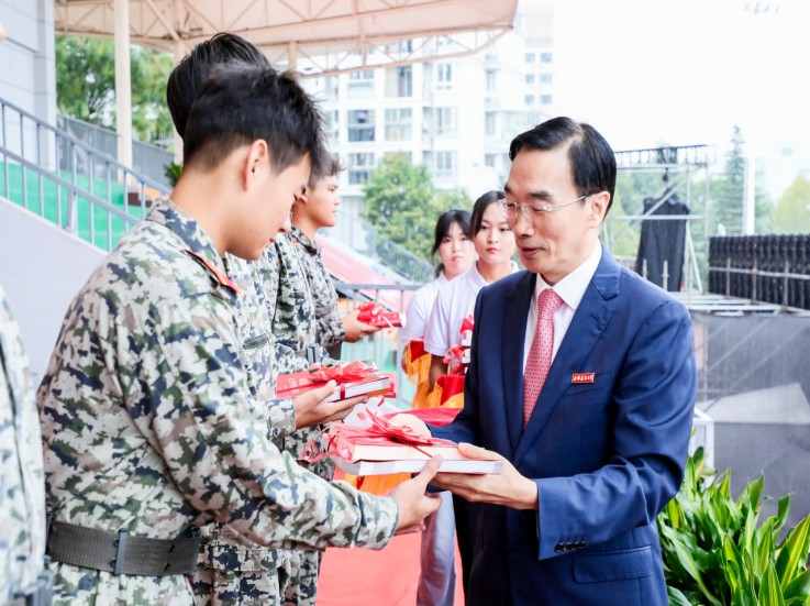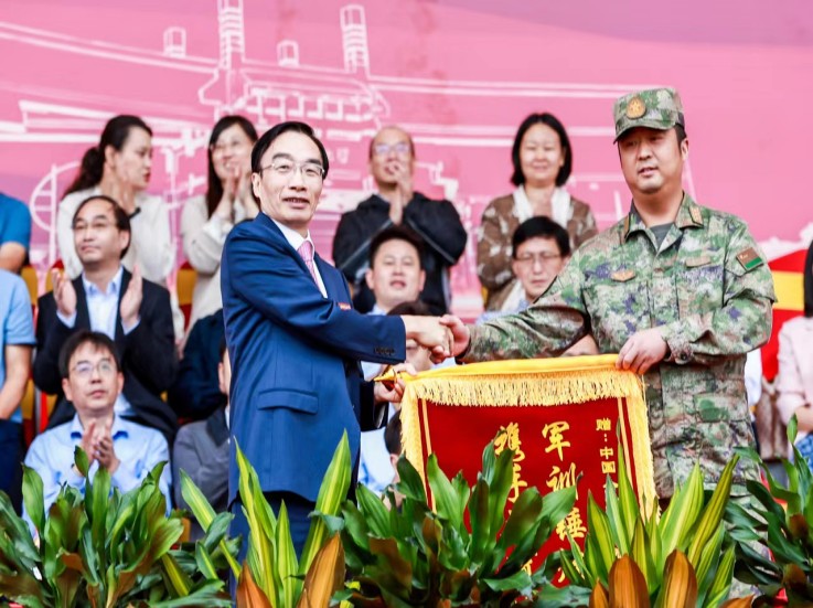 校党委书记孙道胜向承训部队赠送题写“军训锤炼莘莘学子,携手共育中华英才”的锦旗,表达对承训部队辛劳付出的感谢和敬意。