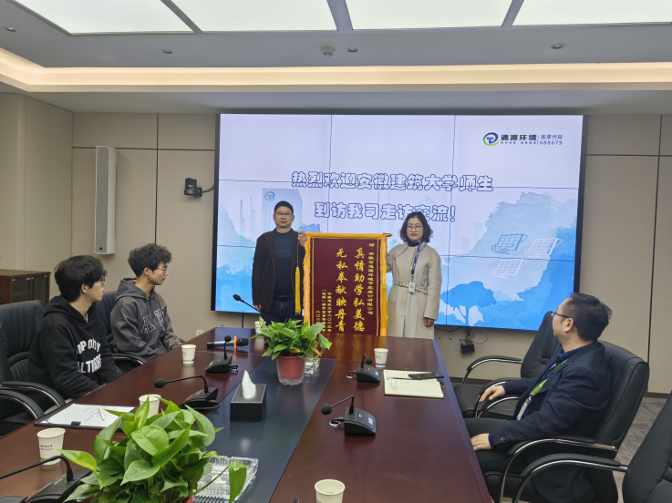 在公司举行的座谈会上,通源环境党总支书记张娜对安徽建筑大学师生参观交流表示欢迎,对获得“通源奖学金”的学生表示祝贺。张娜介绍了企业发展历程、业务范围和运营模式,表达了继续向安徽建筑大学捐资助学、深度开展校企合作的美好愿景。公司人力资源部副经理李杰阐述了公司招聘概况,热忱欢迎我校毕业生加入公司,并为他们提供良好的职业发展平台。座谈会由公司办公室主任丁彦主持。