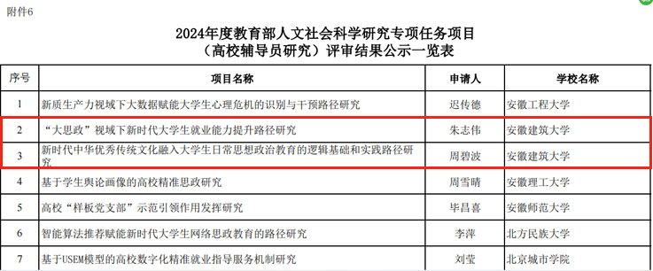 本网讯 近日,教育部社科司公布了《关于2024年度教育部人文社会科学研究一般项目评审结果的公示》,学校多个项目获批立项。其中,专职辅导员朱志伟的项目《“大思政”视域下新时代大学生就业能力提升路径研究》和周碧波的项目《新时代中华优秀传统文化融入大学生日常思想政治教育的逻辑基础和实践路径研究》入选2024年度教育部人文社会科学研究专项任务项目 (高校辅导员研究),成绩喜人。