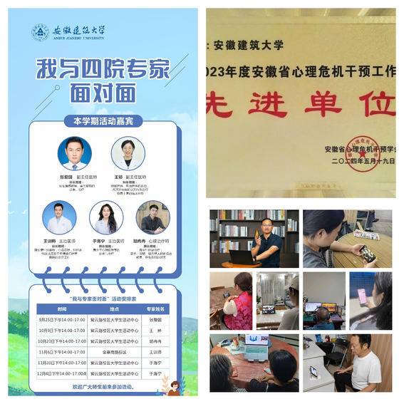 多维联动,构建五方协同模式。学生处加强校医合作,与合肥市第四人民医院机关二支部开展辅导员素质拓展,畅通转介绿色通道,为有需求的学生提供及时专业的心理帮扶,开展16期“我与四院专家面对面”活动。通过召开家长会、举办心育知识讲座,注重家校沟通,形成家校共育合力。对于家庭结构特殊,社会支持少的心理问题学生,学校联合社区力量施以援助,校社联动托起“梦想之翼”。学校荣获安徽省2023年心理危机工作先进集体、安徽省2024年度优秀心理健康教育工作集体荣誉称号。