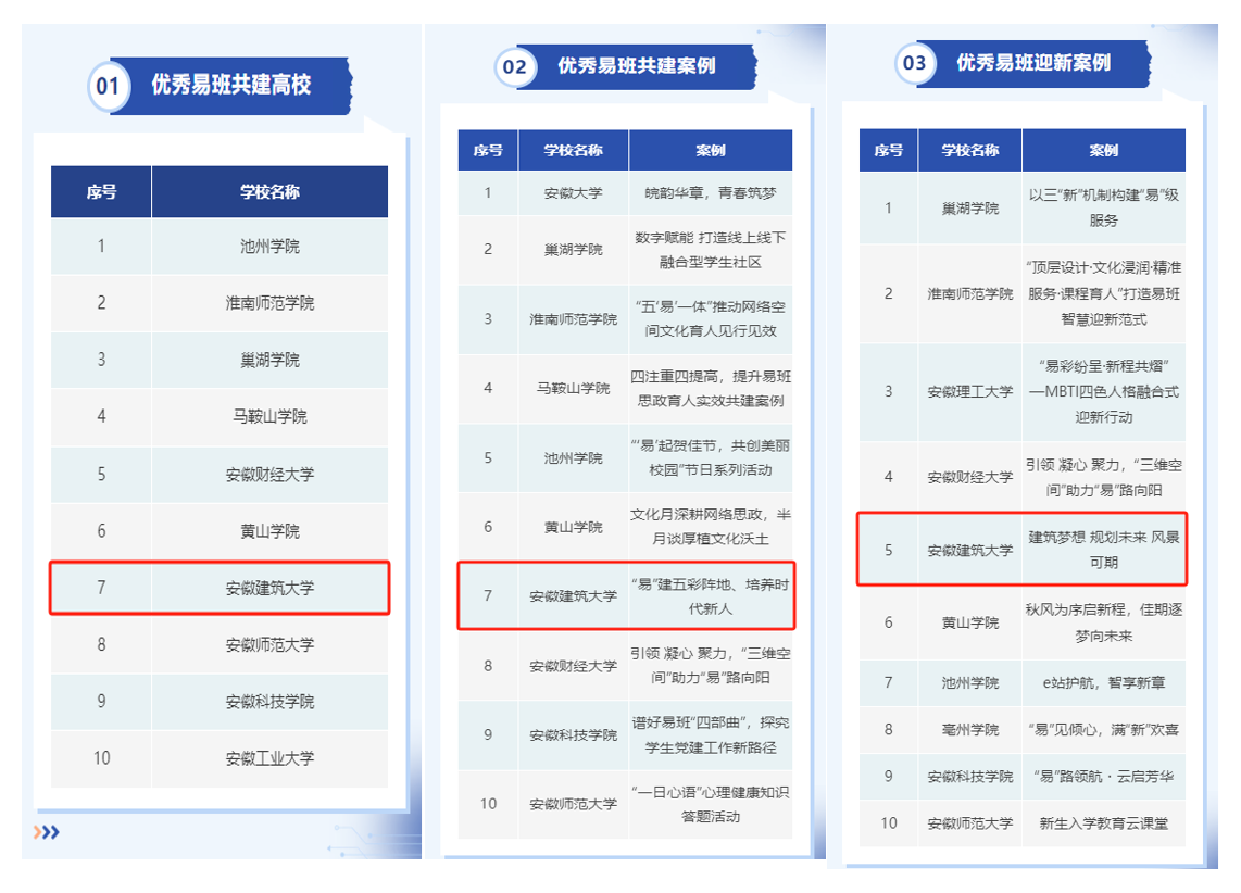 本网讯 近日,安徽省高校网络思想政治工作中心、安徽省高校易班发展中心组织开展了2024年度安徽省高校易班共建工作评优活动。学校在此次评优中取得佳绩,获得了“优秀易班共建高校”“优秀易班共建案例”“优秀易班迎新案例”“优秀易班指导教师”“优秀易班辅导员”多项荣誉。