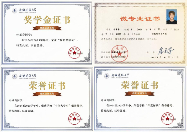 叶承奇,中共党员,安徽建筑大学环境与能源工程学院环境工程专业2022级本科生,班长、学工助理。他先后荣获国家奖学金、校长奖学金、“长丰供水”奖学金、“诗城”奖学金,并连续三年获校一等学业奖学金等。他多次斩获十佳大学生、年度标兵、优秀学生干部、优秀团干部、优秀团员、优秀志愿者、创新创业先进个人等荣誉,个人连续三年获校三好学生荣誉,并带领班级连续三年获校文明班级称号等。现已成功推免至中南大学环境科学与工程专业。本科期间,叶承奇成绩优异,综合测评成绩连续三年均位列专业第一。此外,他主持或参与多项国家级大创项目,发表学术论文多篇,授权或受理国家发明专利多项,竞赛成果丰硕。他还辅修《储能科学与工程》微专业,赴台湾东海大学交换学习,并参与剑桥大学建筑、环境与土木工程项目。