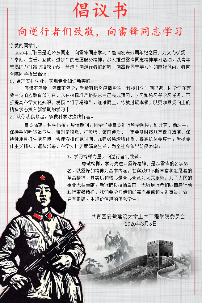 本网讯 3月5日,在毛泽东同志“向雷锋同志学习”题词57周年之际,土木学院以倡议书的形式号召我院全体共青团员和青年学生以自己的实际行动向雷锋同志学习,在日常生活中自觉践行“奉献、友爱、互助、进步”的志愿服务精神,疫情防控期间,合理安排工作、学习和生活,发扬“钉子精神”,解决学习难题,练就过硬本领,提高思想觉悟,向逆行者们致敬。