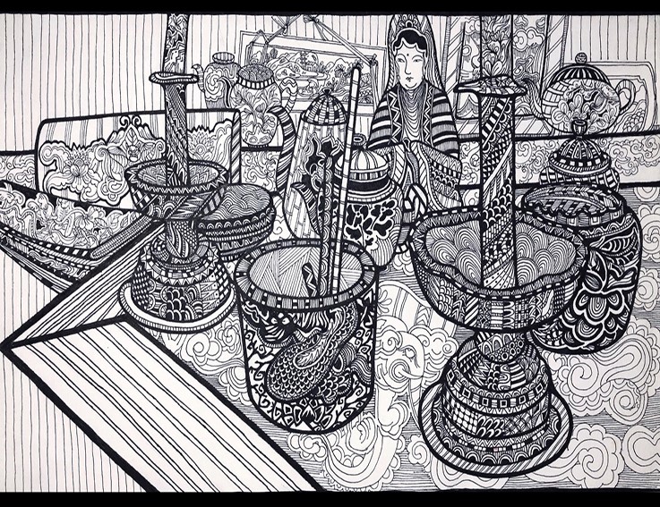 18级环境设计专业张艺馨阅读了《一去二三里》一书,采用黑白创意线描的方式创作作品《凝结的乡野记忆》。该书讲述了青年作家从故乡开始自南向北的旅行故事,展示了中国乡村中最真实,最平凡的生活。绘画作品将白纸黑字中蕴藏的风景在画纸上以独特的形式加以描绘,表达了对古典之美的欣赏。