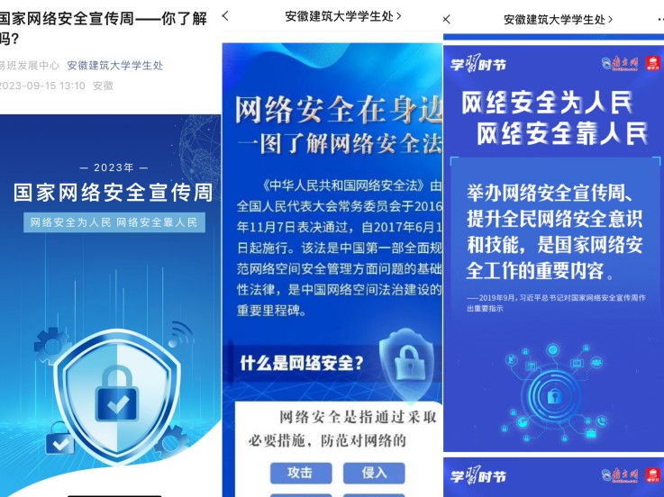 强化网络安全监督管理运行机制,筑牢清朗网络舆论空间。做好公众号、视频号“三审三校”及新媒体年审工作。积极发挥学生骨干的舆论影响力,引导积极向上的健康校园网络文化氛围。积极配合宣传国家网络安全知识,结合2023年国家网络安全宣传周活动“网络安全为人民,网络安全靠人民”的主题,在微信公众号、易班校园号等平台发布网络安全知识,主动配合学校信息网络中心及宣传部门做好网络安全知识推介。