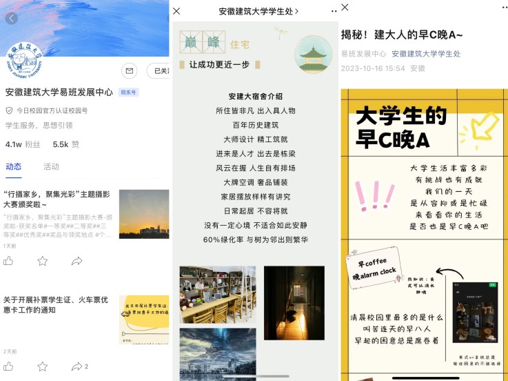 树立“融媒体”思维,搭建融合易班·今日校园、微信号、视频号、QQ号等平台的“媒体矩阵”,坚持理念为先、内容为王、创新为要,紧扣时政热点,结合学生日常学习生活、节庆节点、重要大型校园活动等内容实现各大网络媒体阵地的互融互通和同频共振。2023年,发布微信公众号推文300余篇,平均浏览量达到500+,开设“易班头条”“易师心语”“易建拾光”等安建大校园生活栏目。视频号发布视频30余条,其中“毕业季”“开学季”“校园生活”“考研”“易海湖畔 榜样示范”国奖年度人物专访视频阅读、点赞、评论总量达50000次以上。利用易班校园号互动交流,按照“一月一主题”的思路发布线上宣传海报25期,开设#小匠速递#小匠说#小匠科普等话题,充分发挥校园号线上育人功能。