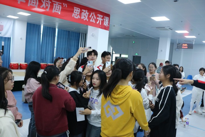 在现场,吴斌、沈晨鹏为师生们示范击剑动作,亲自讲解了几项击剑运动的基础练习,现场气氛活跃、热情高涨。两位奥运健儿耐心回答师生提出的关于学习、竞赛与生活方面的问题,专业、耐心地传授宝贵经验,以身示范、现场教学,让大家受益匪浅,收获颇丰。课后,师生争先地与吴斌、沈晨鹏签名、合影。