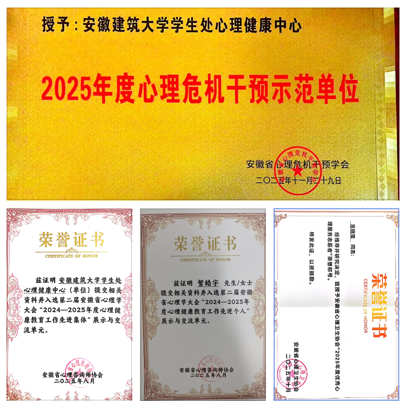 这一荣誉是我校心理健康教育工作持续深耕的缩影。此前,在第二届安徽省心理学大会上,学校曾获评“2024-2025年度心理健康教育工作先进集体”,心理中心教师管皓宇获“先进个人”称号;吉晓青老师在华东心理卫生联盟学术交流会上荣获“优秀心理服务志愿者”称号。系列荣誉的获得,充分反映了我校“学校-学院-班级-宿舍”四级心理预警干预体系的有效运行,以及预防与干预一体化工作格局的日趋成熟。