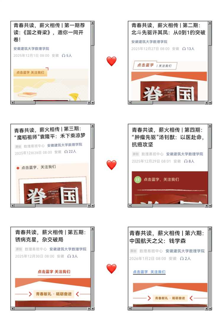 据悉,活动后期还将推出“最佳人气作品”网络投票以及全校接力诵读,进一步打破学院学校边界,吸引更多师生参与互动。此举不仅使“青春共读”的理念更加深入人心,也让薪火相传的力量持续蔓延,形成线上线下联动的阅读生态。未来,数理学院将持续深化品牌活动建设,以书为媒、以读为桥,引导青年学子在勤学善思中成长成才,在薪火相传中践行担当,让青春在为祖国、为人民的奉献中焕发出绚丽光彩。(作者:赵妮;一审:林浩东;二审:张毅;三审:胡燕青、徐庆和)