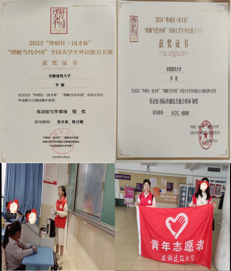 李湘,安徽建筑大学外国语学院2022级英语专业本科生,中共预备党员。曾荣获校一等奖学金、通源社会奖学金、“校十佳大学生”等。自大一以来,成绩一直保持优异,前三年平均学分绩点为4.36,位居专业第一。同时,她积极参加学科竞赛和大创项目。曾获2023“外研社·国才杯”全国英语写作大赛国家级银奖、省级一等奖(第1名),2024“外研社·国才杯”国际传播综合能力大赛国家级铜奖、省级一等奖(第1名),2025“外教社·词达人杯”大学生英语词汇能力大赛省级一等奖、校级特等奖(第1名),2024“外研社·国才杯”全国英语笔译大赛校级金奖,2023和2024外研社·国才杯”全国英语演讲大赛校级银奖等;主持了题为“乡村振兴背景下安徽地区语言扶贫路径研究”的大创项目且获优秀结项。现已保研至南京师范大学英语语言文学专业。
