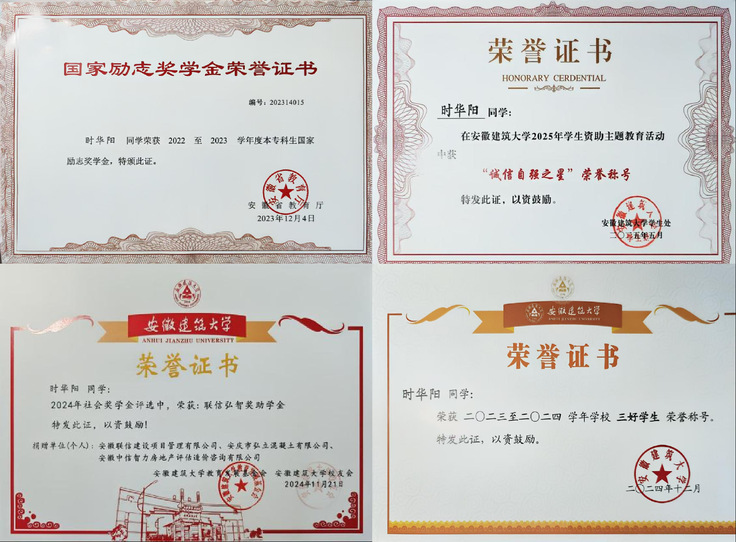 在学习方面,时华阳同学始终保持着好学上进的态度,深耕科学文化知识领域,不断提高文化素养。课堂上,他认真听老师讲课,详实记录课堂笔记,积极与老师互动。课后主动完成作业,当遇到不懂的难题时,会积极与同学讨论或虚心地向老师请教。同时,他还广泛地阅读与物理学相关的书籍,不断夯实专业基础,学业水平得以显著提升。在大学中,他的学习成绩在班级中名列前茅,曾荣获联信弘智奖助学金和校二等奖学金,并获评“三好学生”和“诚信自强之星”等荣誉称号。