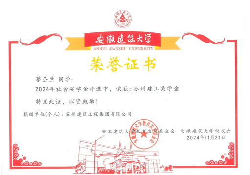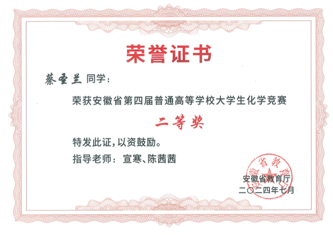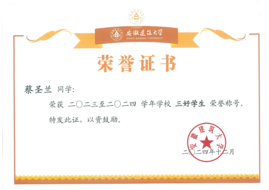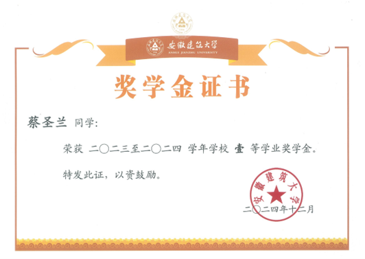 蔡圣兰,安徽建筑大学材料与化学工程学院2022级应用化学专业本科学生,担任班级宣传委员。曾荣获校一等奖学金、社会奖学金、校三好学生等荣誉。自大一以来,成绩一直保持优异,课程绩点3.88,多门专业课程成绩90+,并顺利通过英语四六级和计算机二级,现成功保研至合肥工业大学材料科学与工程专业。