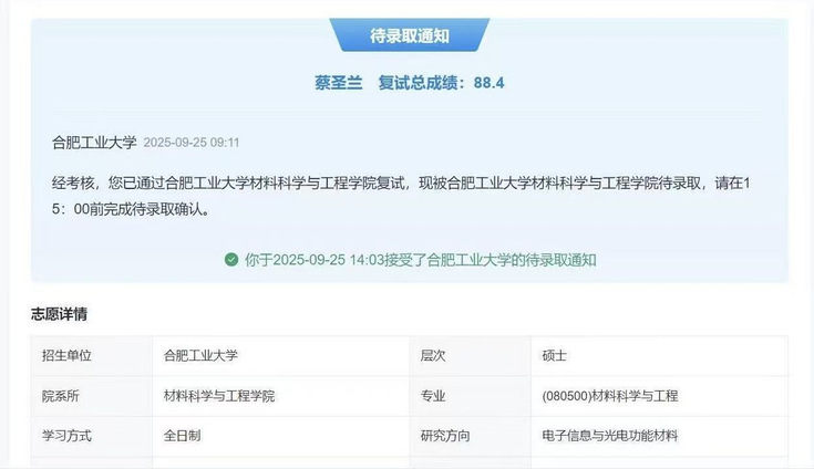 回望四年大学生活与保研之路,感恩母校提供的优质教育资源与广阔平台,让她能够在知识的海洋中自由翱翔;感恩导师的悉心指导与无私帮助,在科研探索中为她指明方向,往后,她将带着这份保研成功的感悟,在合肥工业大学的校园里继续逐光前行。以更严谨的态度对待学术,以更饱满的热情拥抱生活,以更坚定的信念追逐梦想。愿每一个心怀远方的人,都能在漫长的时光里默默耕耘,相信终有一天,所有的坚持都会开花结果,所有的等待都会如期而至。毕竟,那些看似不起波澜的日复一日,终将在某天让你看到坚持的意义——渡梦成光,不负韶华。(文/图:张莹、蔡圣兰;一审:何世明、方绍正;二审:帅英;三审:孙长城、徐庆和)