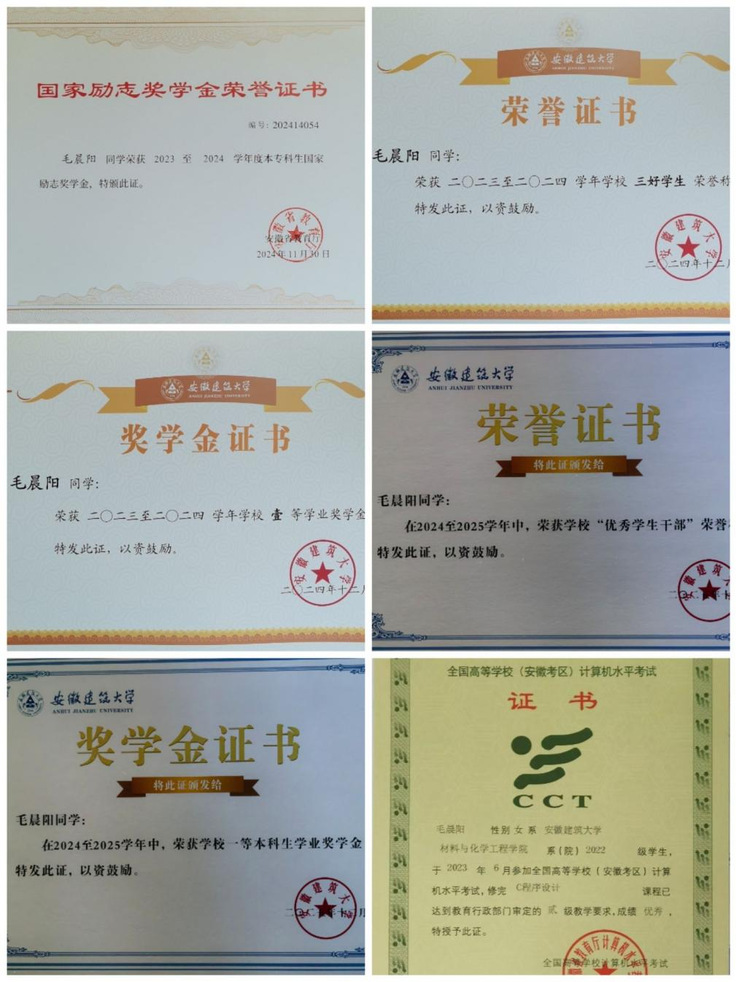 毛晨阳,中共预备党员,安徽建筑大学材料与化学工程学院2022级金属材料工程专业学生,现已保研至合肥工业大学材料科学与工程专业。毛晨阳专业成绩优异,前六学期平均绩点3.66(1/53),在校期间她多次荣获国家励志奖学金、校一等奖学金、三好学生、优秀班干、校优秀团干与团员、优秀志愿者等。毛晨阳始终以“脚踏实地,深耕细作”为信条,在学业与科研的赛道上稳步前行,她用三年的坚持与探索,敲开了保研的大门,也为材料学科的学习之路写下了属于自己的注脚。