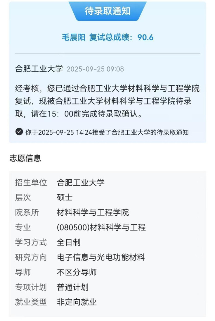 回望保研之路,毛晨阳坦言,没有一蹴而就的成功,只有日复一日的积累。感谢母校的悉心培养,感谢导师的谆谆教诲,也感谢那个始终坚持、不曾放弃的自己。对于学弟学妹,她想说:“找准自己的方向,把每一门课学扎实,把每一次实验做认真,时间会给努力最好的答案。”未来,她将继续深耕材料领域,带着对专业的热爱与执着,在科研与学习的道路上继续笃行不怠,奔赴属于自己的山海。(文/图:何世明、毛晨阳;一审:李碧虹、方绍正;二审:帅英;三审:孙长城、徐庆和)