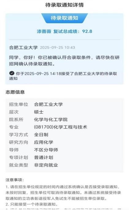 最终,漆蔷薇凭借扎实的专业成绩、丰富的综合素养,成功保研至合肥工业大学化学与化工学院化学工程与技术专业(应用化学方向),为自己的本科求学之路交出了一份亮眼的答卷。未来,她也将在新的赛道上继续以勤为帆、以志为桨,奔赴更广阔的科研与学习征程。(文/图:李刚、漆蔷薇;一审:何世明、方绍正;二审:帅英;三审:孙长城、徐庆和)