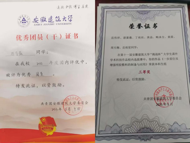 漆蔷薇,中共党员,安徽建筑大学材料与化学工程学院2022级高分子材料与工程专业本科生,现已保研至合肥工业大学化学工程与技术专业。漆蔷薇专业成绩优异,前六学期平均绩点3.54,在校期间,她连续三年斩获校级二等奖学金,多次获评校三好学生、优秀团员、优秀团干等荣誉称号,同时积极投身社会实践与学科竞赛,用行动诠释着新时代大学生的责任与担当。