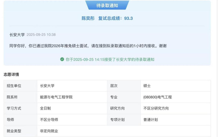 三年深耕不辍,终得硕果累累。在选择保研院校时,陈奕彤结合自身对电气工程领域的兴趣、长安大学的学科实力与科研平台,最终确定了新的逐梦起点。她认为,保研不仅是对过往努力的认可,更是下一段学术旅程的开端。