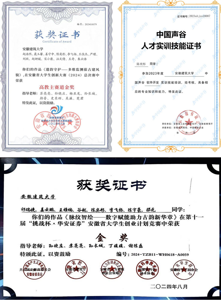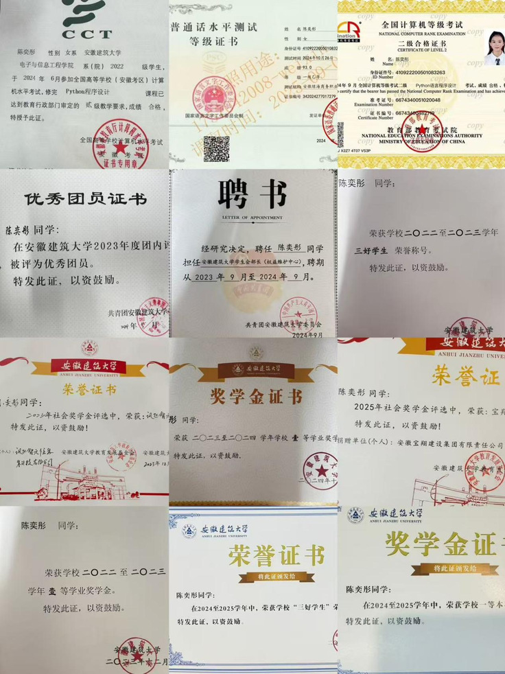 陈奕彤拒绝单一化成长,主动探索自身潜力,在多领域实现综合素质提升。她深耕语言能力,在第四届“外教社·词达人杯”全国大学生英语词汇能力大赛中斩获安徽建筑大学本科非英语类专业组校赛一等奖;涵养文化素养,参与春日主题手抄报大赛获校级二等奖,参演红色情景剧获评院级一等奖、校级优秀奖;规划未来发展,在第十五届安徽建筑大学大学生职业规划大赛中荣获校级三等奖,清晰锚定成长方向。在一次次历练中养成了沉稳务实、勇于突破的品格,真正实现德智体美劳全面发展,让青春在多元成长中绽放别样光彩。