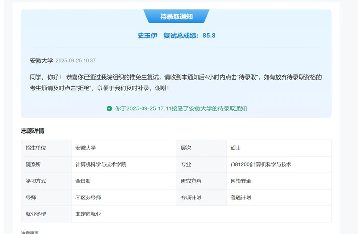 带着这份锐气与在大学熔炉中锻就的品格,她即将在安徽大学开启新的学术征程。她深知,保研只是一个新的起点,她将带着这三年收获的一切——扎实的专业知识、解决问题的勇气、服务他人的意愿,以及认真生活的能力——继续向前,去探索、去创造,去成为更好,也更完整的自己。(文/图:杨玲、史玉伊;一审:丁媛媛、方绍正;二审:帅英;三审:张润梅、徐庆和)