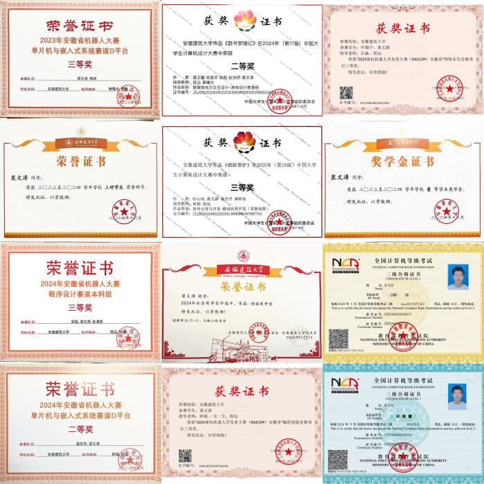 裴文涛,中共党员,安徽建筑大学电子与信息工程学院2022级网络工程专业本科生。自大一以来,成绩始终名列前茅,专业排名稳居前1%,凭借扎实的专业能力与全面的综合素质,成功保研至合肥工业大学计算机与信息学院计算机技术专业。本科期间,他兼顾理论学习、科研创新与工程实践,积极参加各类学科竞赛,累计斩获国家级竞赛奖项2项、省级竞赛奖项12项,以项目负责人身份完成国家级大创项目1项,作为主要完成人参与省级大创项目2项,连续三年荣获“三好学生”“学习先进个人”等荣誉称号,曾获诗城奖学金、校一等奖学金等多项奖励。