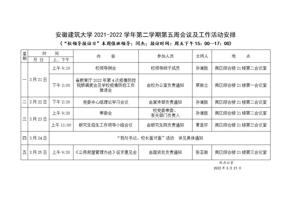 安徽建筑大学2021-2022学年第二学期第五周会议及工作活动安排