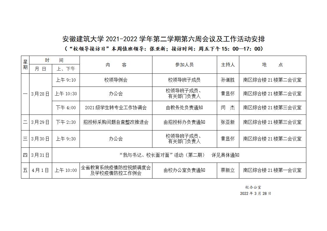 安徽建筑大学2021-2022学年第二学期第六周会议及工作活动安排