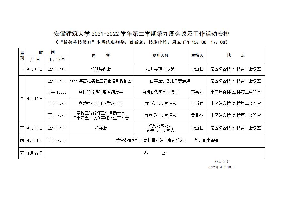 安徽建筑大学2021-2022学年第二学期第九周会议及工作活动安排