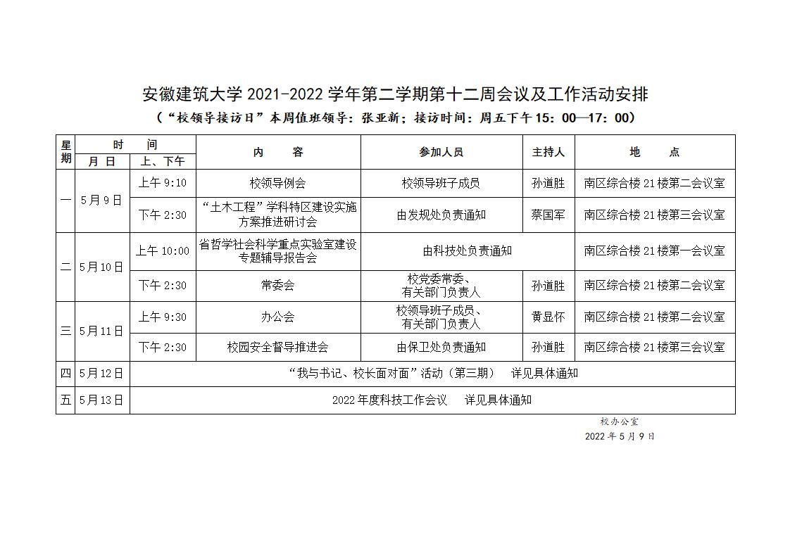 安徽建筑大学2021-2022学年第二学期第十二周会议及工作活动安排