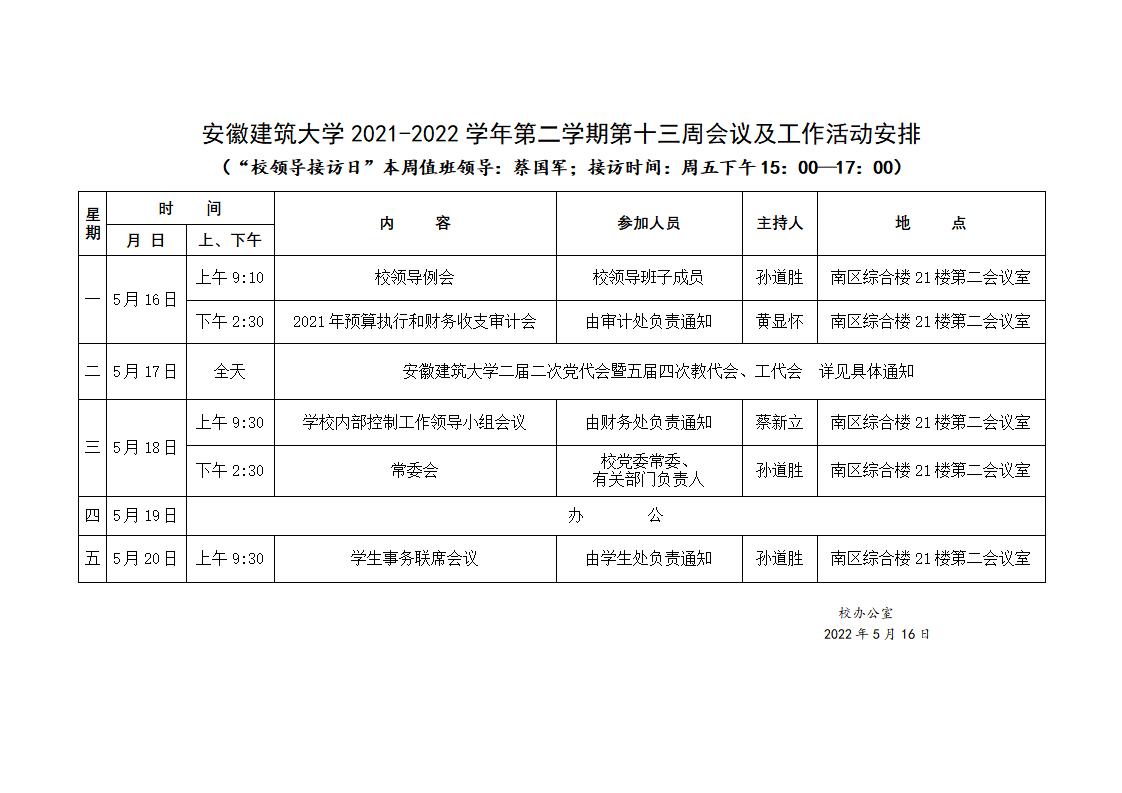 安徽建筑大学2021-2022学年第二学期第十三周会议及工作活动安排