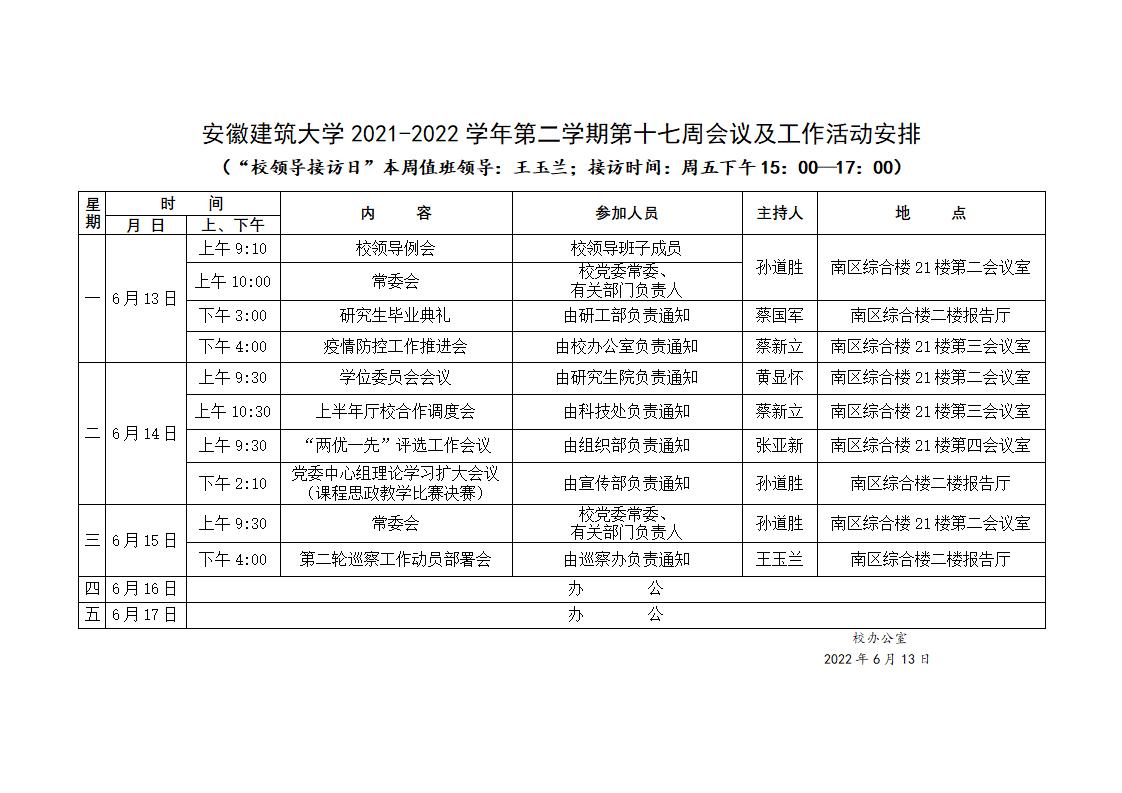 安徽建筑大学2021-2022学年第二学期第十七周会议及工作活动安排