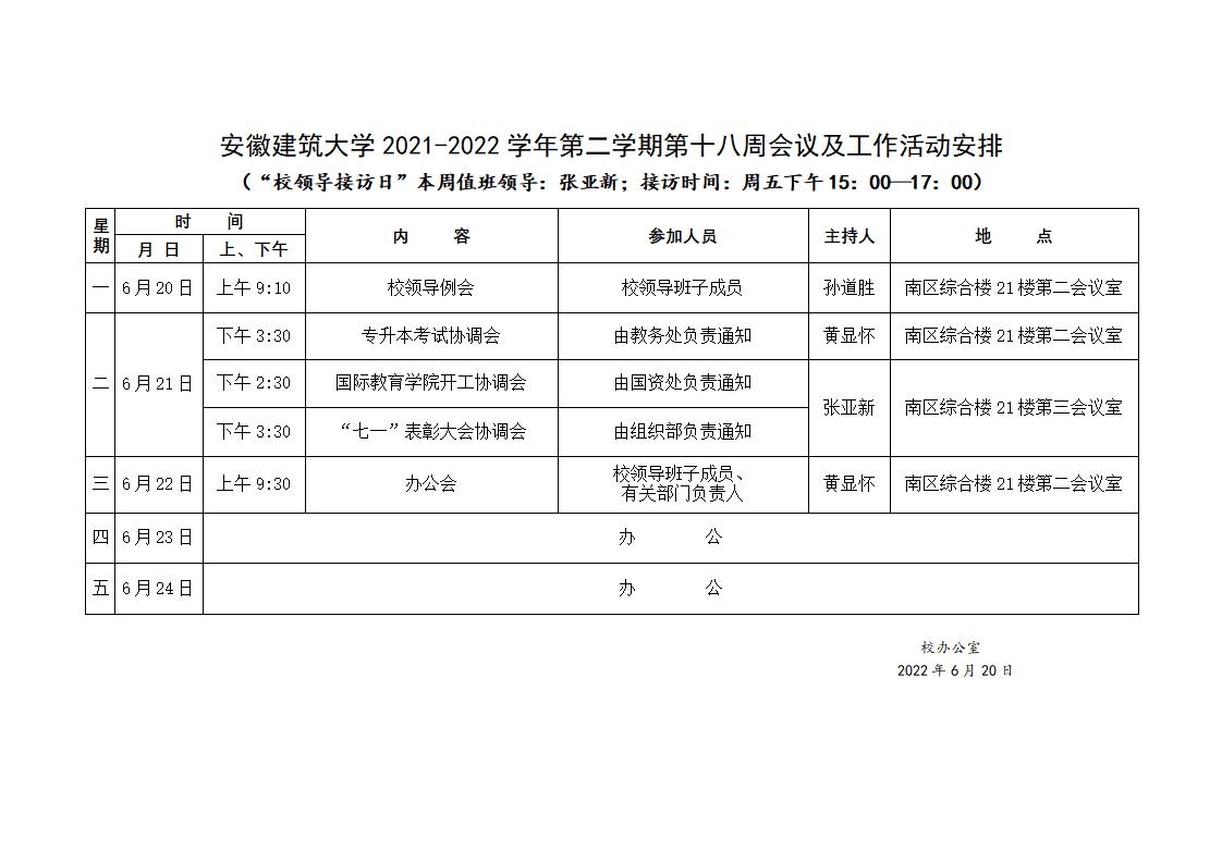 安徽建筑大学2021-2022学年第二学期第十八周会议及工作活动安排